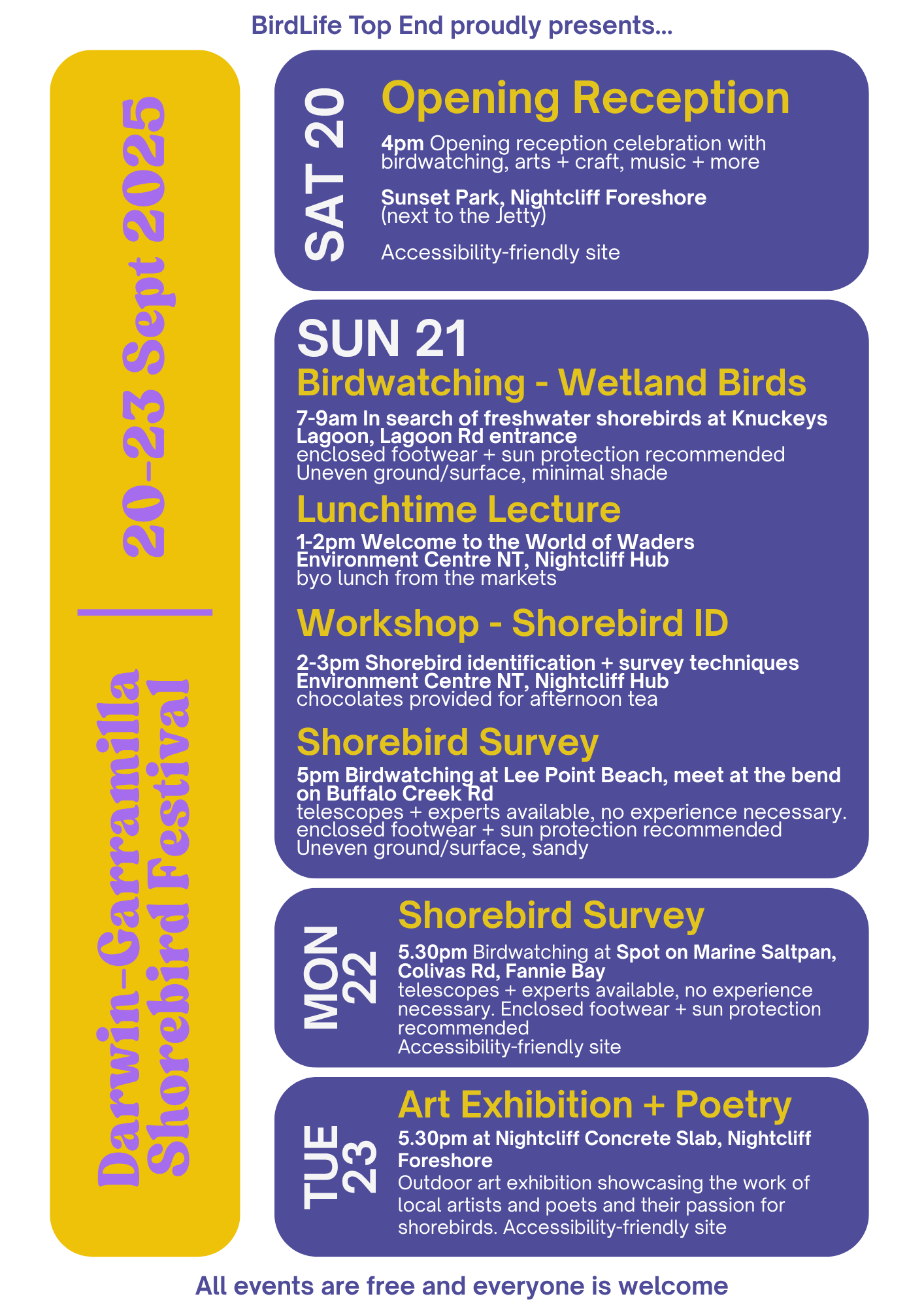 The Darwin-Garramilla Shorebird Festival is a community festival held annually at multiple locations around Darwin-Garramilla in September.